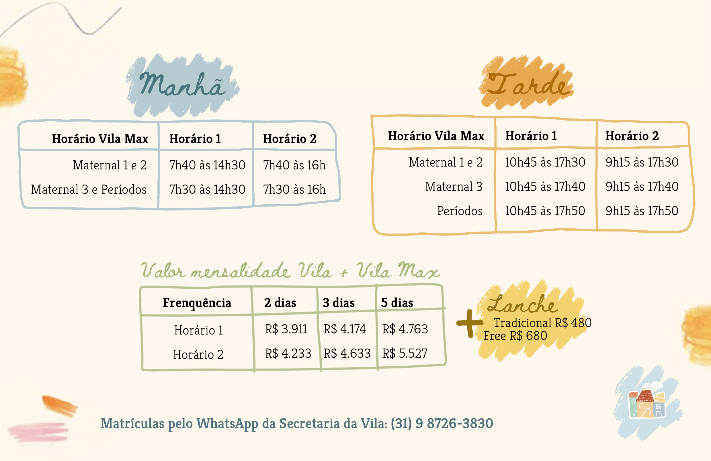 Pensando em ir além, criamos o Vila Max, um tempo que soma, que expande e que traz: traz o almoço da Vila, o ateliê, a oficina, o brincar completo, mais cor, mais texturas, mais som, mais alegria.